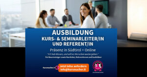 Ausbildung zur/zum Kurs- & Seminarleiter/in und Referent/in In Südtirol – 3 Präsenztage + 1 Online-Modul Das erfolgreiche Ausbildungskonzept von Kursmacher.it – jetzt neu & aktualisiert Wer Wissen vermittelt, bewegt Menschen – und schafft echte Wirkung. Diese Ausbildung macht Dich dazu befähigt, eigene Kurse, Trainings und Seminare sicher zu planen, professionell aufzubauen und souverän durchzuführen. Egal, […]