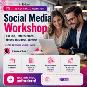 👉👉🎯 2-tägiger Social Media Workshop inkl. KI 1 Tag ONLINE, 1 Tag in Präsenz – in Bozen. für Unternehmen, Selbständige, Mitarbeiter, Vereine 💪 👩💼👸🤴 👉 Art: Workshop & Gruppencoaching mit begrenzter Teilnehmerzahl 👉 Dauer: jeweils 9-16 Uhr 👉 Kosten: € 480 + Mwstr. 👉 Firmen/Vereins-Rabatt für mehrere Teilnehmer: Ein Teilnehmer bezahlt, max. zwei weitere […]