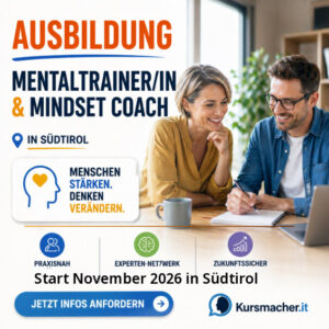 Mentaltrainer- und Mindset-Coach Ausbildung 2026/27 Menschen stärken. Denken verändern. Ergebnisse erzeugen. Dauer & Format Termine 19./20. November 2026 – Präsenz 3. Dezember 2026 – Online 21./22. Jänner 2027 – Präsenz 25./26. Februar 2027 – Präsenz 18. März 2027 – Online 22./23. April 2027 – Präsenz Uhrzeiten: jeweils 9–17 Uhr Gesamtdauer: 5 Monate Format: Hybrid (Präsenz […]