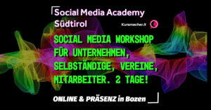 👉👉🎯 2-tägiger Social Media Workshop . 1 Tag ONLINE, 1 Tag in Präsenz – in Bozen. für Unternehmen, Selbständige, Mitarbeiter, Vereine 💪 👩💼👸🤴 👉 Art: Workshop & Gruppencoaching mit begrenzter Teilnehmerzahl 👉 Dauer: jeweils 9-16 Uhr 👉 Kosten: € 480 + Mwstr. 👉 Firmen/Vereins-Rabatt für mehrere Teilnehmer: Ein Teilnehmer bezahlt, max. zwei weitere Mitarbeiter […]