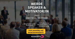 Werde Speaker & Motivator Drei Einstiegs-Webinare für deinen Speakerstart Du willst Menschen begeistern, bewegen und inspirieren? Dann starte jetzt mit der Mini-Reihe „Speaker-Webinare“ – deinem Einstieg in die Welt des professionellen Sprechens. Erlebe in drei Online-Abenden, was erfolgreiche Speaker ausmacht – und was in dir steckt. Jedes Webinar ist einzeln buchbar – oder du nutzt […]