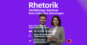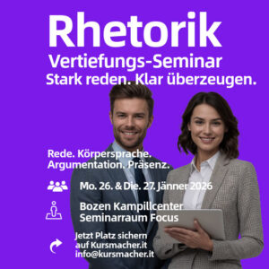 ⏱ RHETORIK-SEMINAR SÜDTIROL: VON PROFIS LERNEN: 📌📅 👉 Do, 29. und Fr, 30. Jänner 2026 – IN BOZEN 👩 ⏱. Am Donnerstag von 09.00 bis 18.00 Uhr – am Freitag von 9.00 bis 13.00 Uhr. Maximal 7 Teilnehmer – um Ihre rhetorischen Schwächen durch individuelle Einzelanalysen gezielt zu korrigieren! Teilnahmegebühr: 480€ Kursort: Seminarzentrum Focus.Kursmacher Südtirol, […]